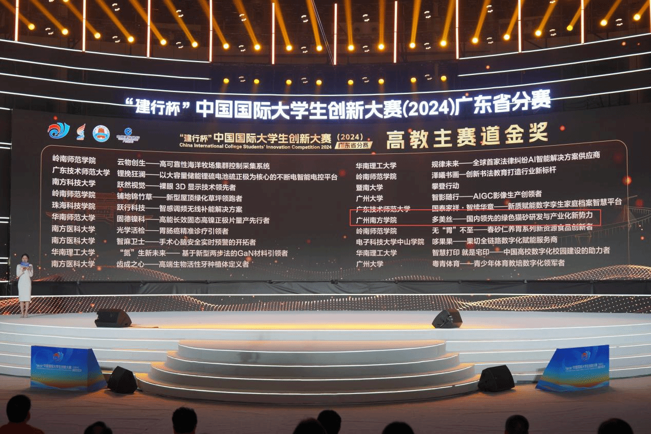 8月21日,中国国际大学生创新大赛广东省分赛在岭南师范学院落下帷幕。本次比赛共有来自广东省各高校370个项目会师决赛,经过激烈的角逐,我校公共管理学院“多美丝——国内领先的绿色猫砂研发与产业化新势力”项目团队脱颖而出,获得金奖。这是我校首次由在校学生组队获得省级金奖。