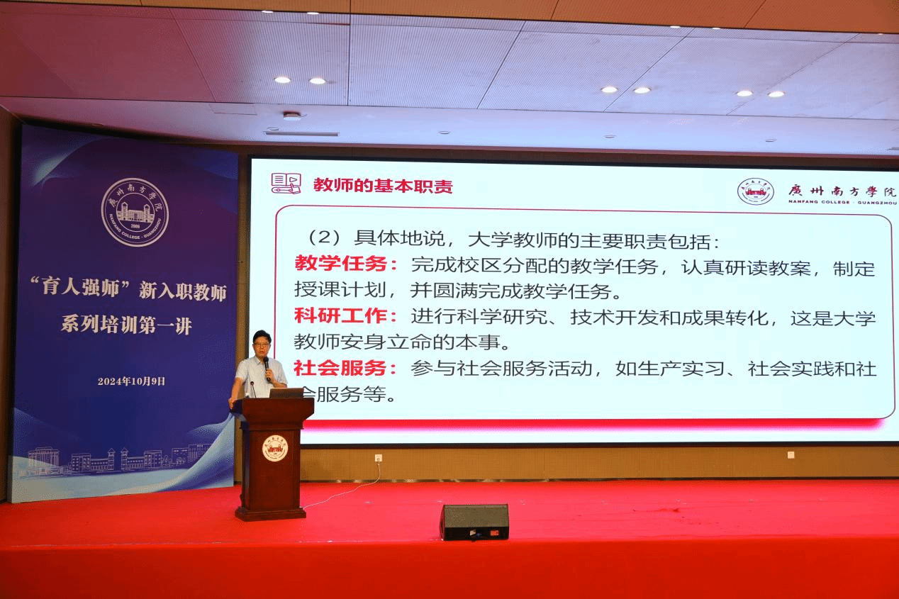 曹广福副校长围绕“教师的基本职责”、“如何站好三尺讲台”、“如何管理课堂”三方面,探讨如何提升新入职教师的教学技能和专业素养。他强调,教师作为学生的引路人,应当以促进学生全面发展为己任,不仅传授知识,更要关注学生的个性化成长和情感需求。