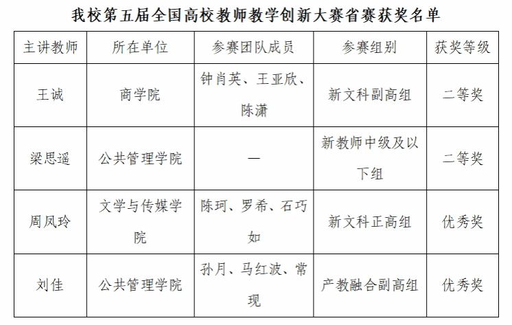 5月16日至18日,第五届全国高校教师教学创新大赛广东分赛暨广东省高校教师教学创新大赛在广东外语外贸大学成功举办。经过网络评审与现场决赛的激烈角逐,我校参赛教师凭借扎实的教学功底和突出的创新成果,从全省74所本科高校的603位参赛教师(团队) 中脱颖而出,斩获二等奖2项、优秀奖2项,充分展现了我校教师的教学风采和创新能力。