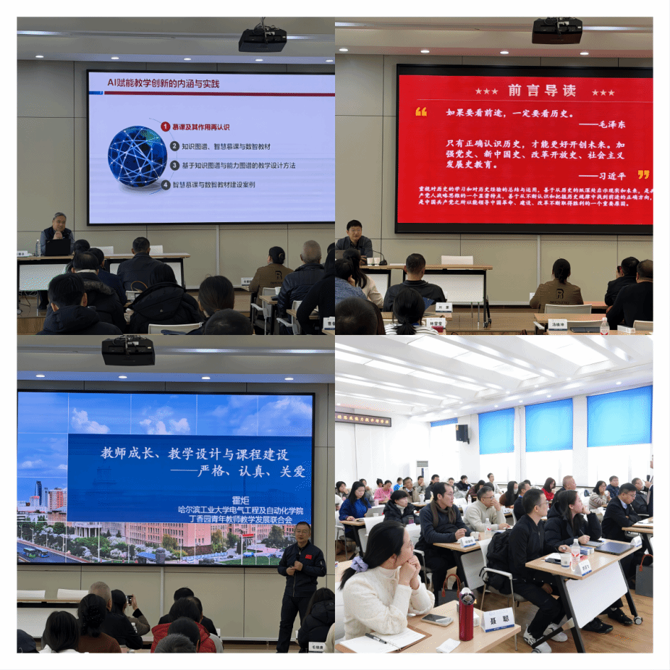 研修班特邀哈尔滨工业大学多位资深专家学者进行专题授课,课程内容兼具理论高度与实践深度。计算学部战德臣教授以“AI赋能教学创新的内涵与实践”为题,系统梳理了慕课发展脉络,深入讲解了基于知识图谱与能力图谱的数字化教学设计,展现了智能技术赋能教育形态的广阔前景。电气工程及自动化学院霍炬教授结合国家级一流本科课程的建设经验,通过生动的电路课程思政案例,系统阐释了教师成长、教学设计与课程建设的协同路径。能源科学与工程学院高继慧教授分享了其在创新教育与实践教学改革方面的长期思考与独到见解,激发了学员对人才培养模式创新的深入反思。继续教育学院曹云峰副院长则以东北铁路历史为镜,深入探讨了如何将地方红色文化资源有机融入课程思政,实现知识传授与价值引领的“润物无声”。