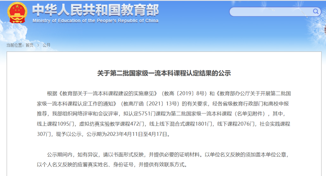 教育部关于第二批国家级一流本科课程认定结果的公示