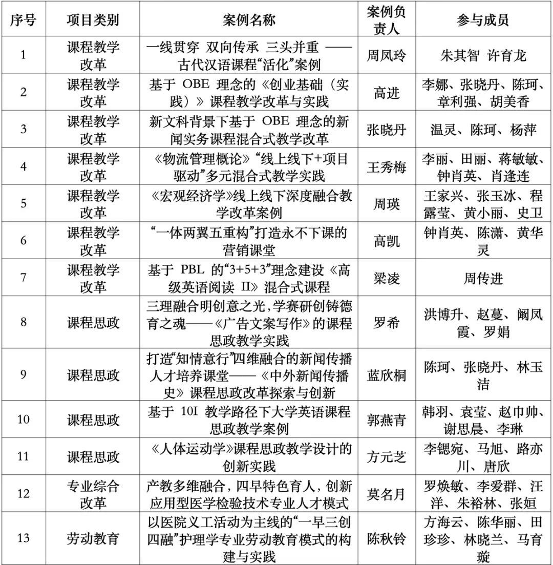 近日,广东省高等学校教学管理学会公布了2023年度教育教学优秀案例名单,我校共13项案例获得省级教育教学优秀案例,其中包括课程教学改革优秀案例7项、课程思政建设优秀案例4项、专业综合改革优秀案例1项、劳动教育优秀案例1项。