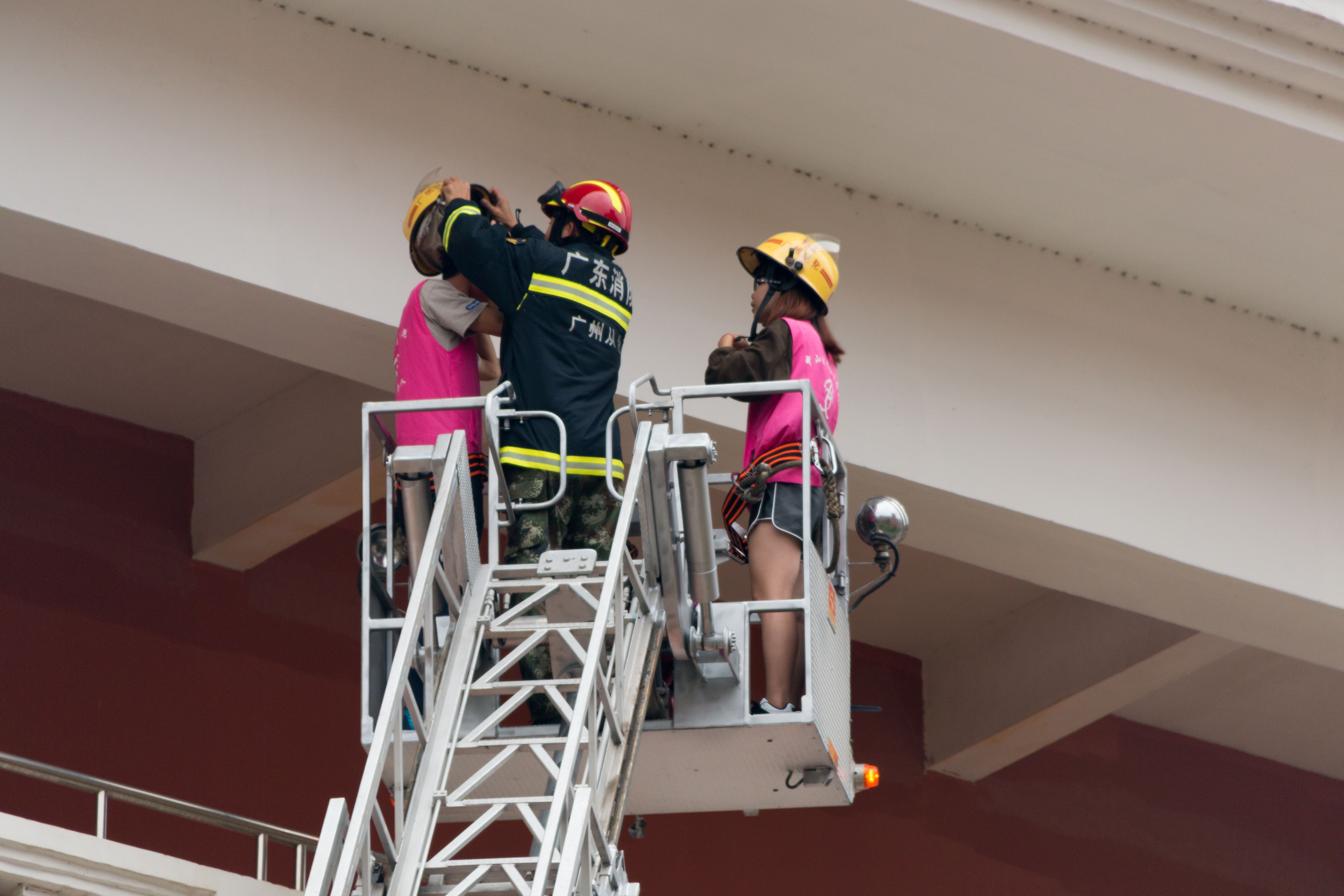 第一阶段为逃生自救阶段。模拟第4实验楼内突然发生警情(电短路引燃出现火情、危化品爆炸烟雾蔓延),现场混乱,情况危急。由学校应急组织引导被困师生和工作人员进行疏散逃生,消防队架设云梯救助顶楼被困人员。