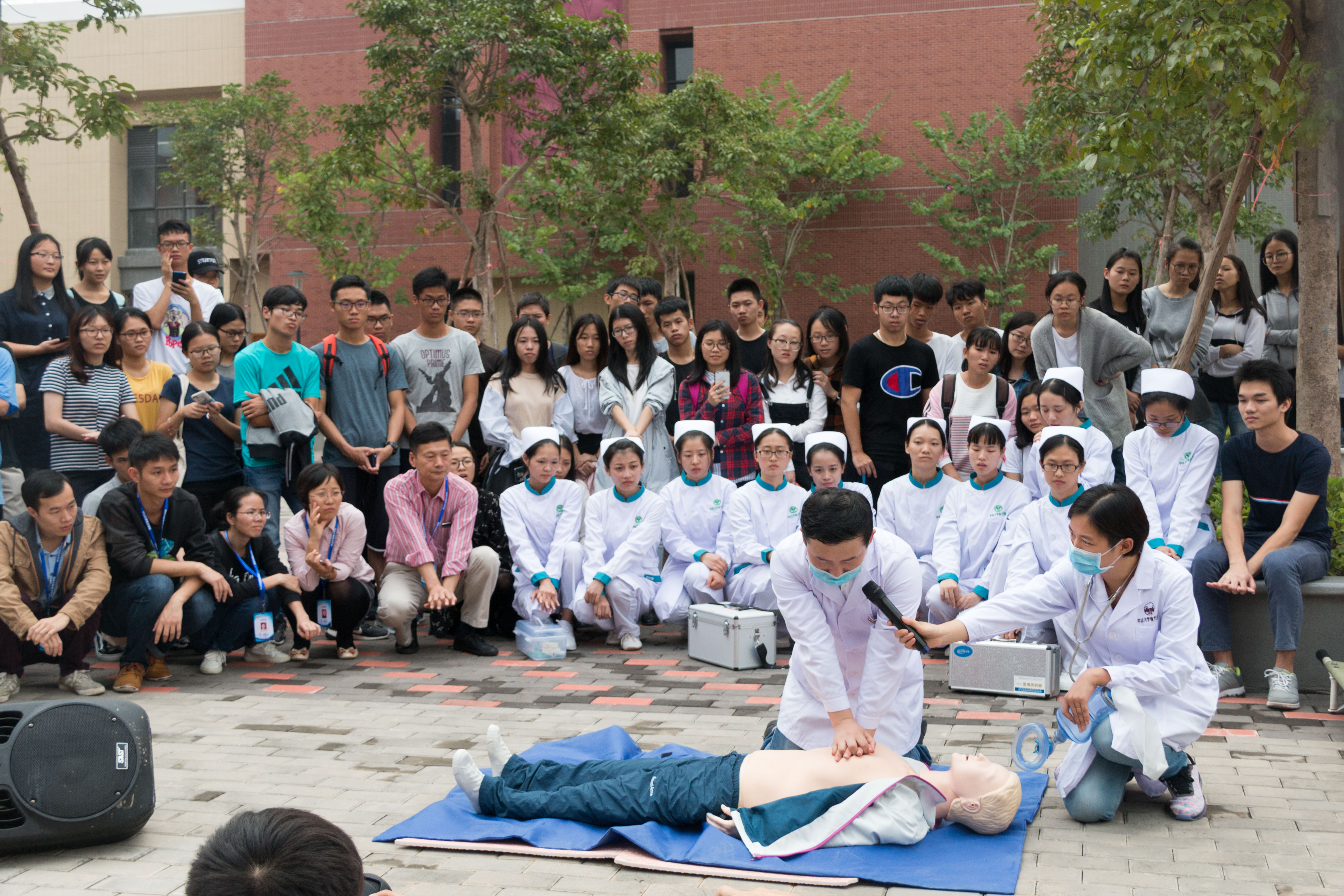 第二阶段为心肺复苏施救阶段。模拟多名人员被烟雾窒息,在担架救离第4实验楼火场后,由医务室和护理系师生进行心肺复苏操作示范演练。