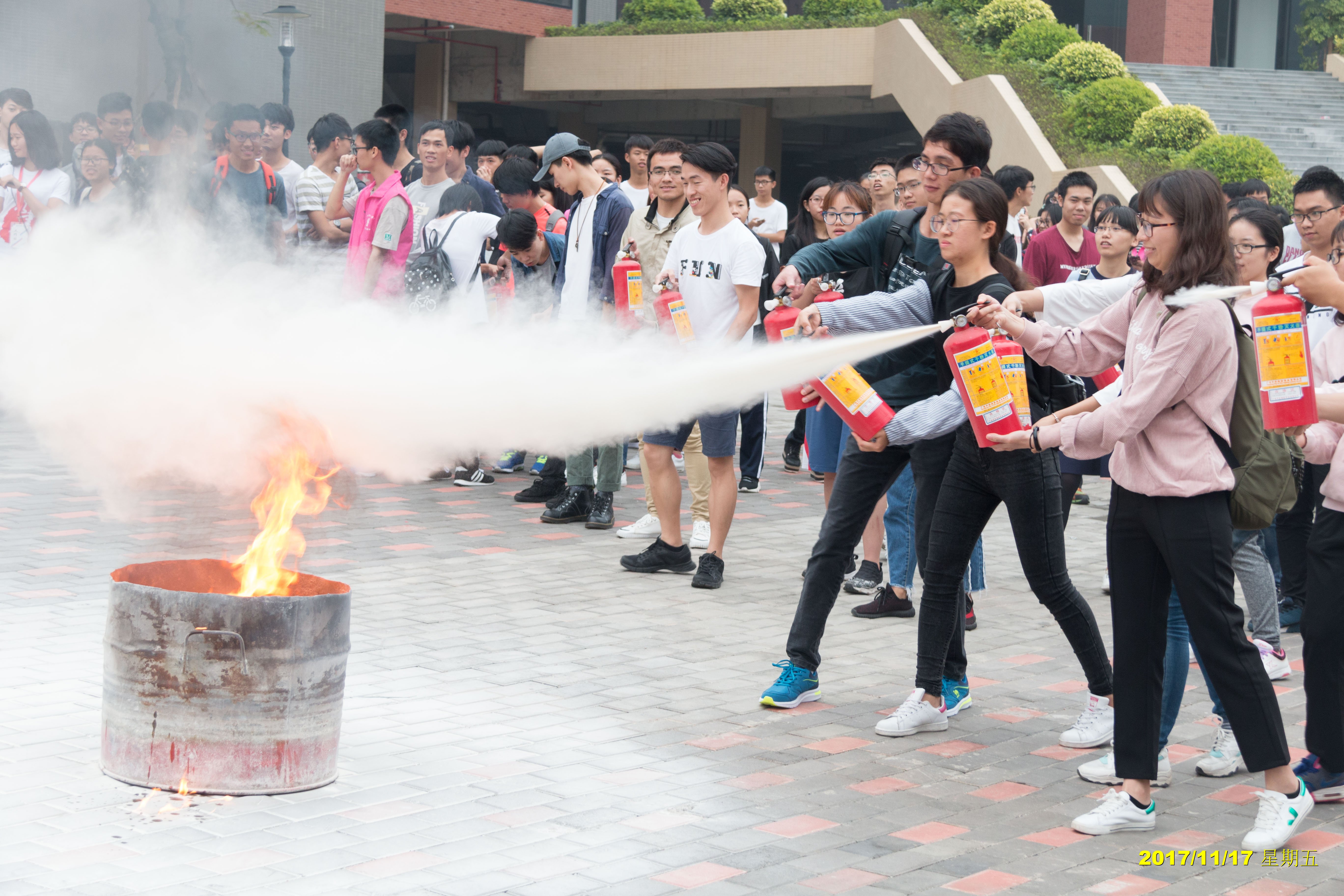 第三阶段为消防器材使用实操演练。由江浦消防中队对所有参演人员进行消防技能培训,全体参与人员轮流使用灭火器材进行实操演练。