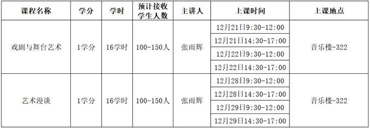 音乐系将于1221-22日,1228-29日,邀请张雨辉教授作为主讲,分别开设两门学术报告型公选课《戏剧与舞台艺术》、《艺术漫谈》。每门公选课1学分,可分别接收100150名同学报名。