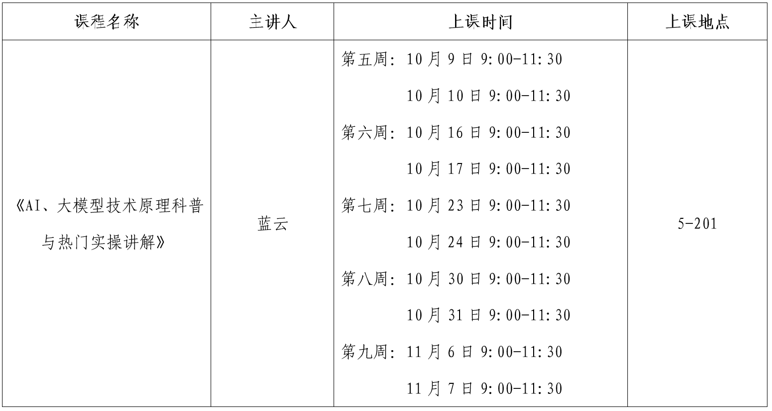 公共管理学院将于第5周至第九周,开设一门学术报告型公选课《AI、大模型技术原理科普与热门实操讲解》,聘请蓝云老师主讲。