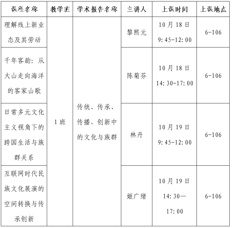 公共管理学院将于101819号,开设一门学术报告型公选课《传统、传承、传播、创新中的文化与族群》,聘请黎熙元教授、陈菊芬教授、林丹讲师、姬广绪副教授主讲。
